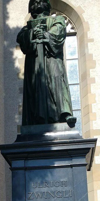 Around 800 AD, Charlemagne founded the Holy Roman Empire. His statue is in Zurich's Grossmunster. Seven hundred years after Charlemagne, this was the headquarters of the Swiss Reformation, led by Pastor Ulrich Zwingli. The Protestant Reformers followed the Catholics in applying the theory of "two swords": church and state worked together to enforce God's rule, All citizens had to belong to one church. But a group called "Anabaptists" rejected this. They insisted that the New Testament tells believers to form self-governing churches. A memorial (below) to Felix Manz and others marks where their death sentence was carried out, by drowning.
